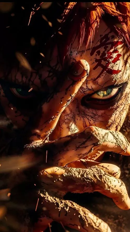 Ảnh Gaara thường hợp gam đất, ánh sáng gắt và nền tối giản để đẩy mạnh thần thái. Chữ Ái là điểm neo thị giác cực mạnh, còn viền mắt đen tạo cảm giác vừa mệt mỏi vừa cảnh giác. Khi thêm hiệu ứng cát xoáy hoặc bão cát nhẹ, bức hình lập tức có độ động, giống như phòng thủ đang kích hoạt. Tổng thể vừa lạnh vừa đẹp, kiểu đẹp có câu chuyện, nhìn một lần là khó quên.