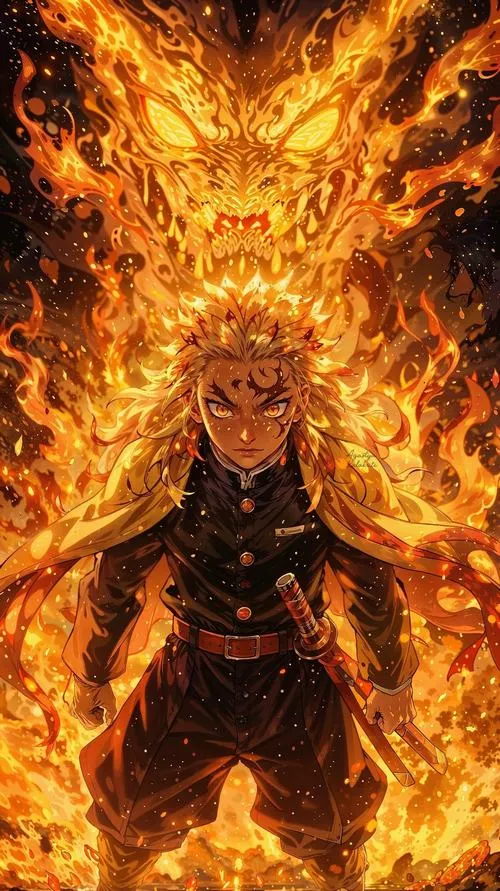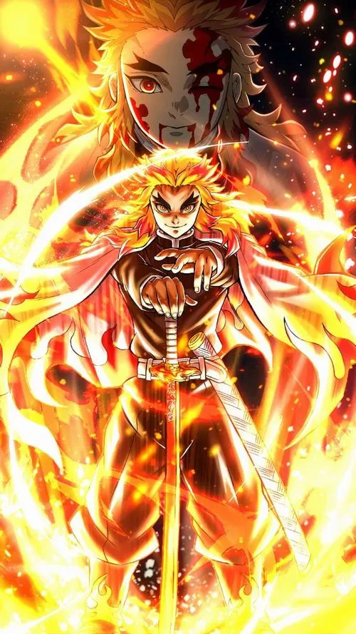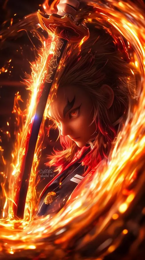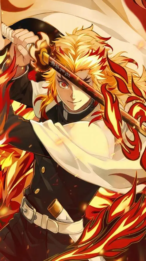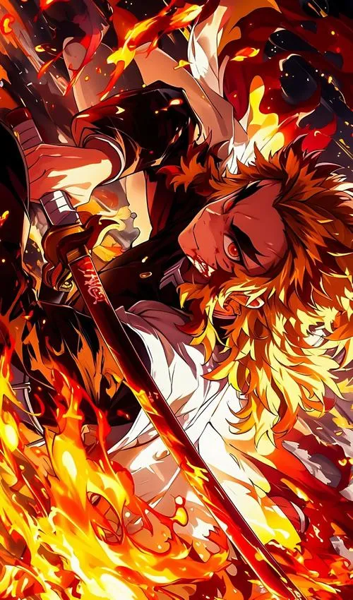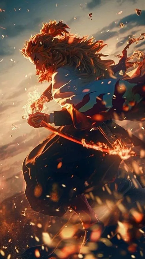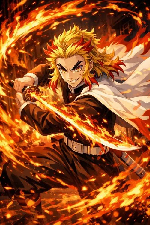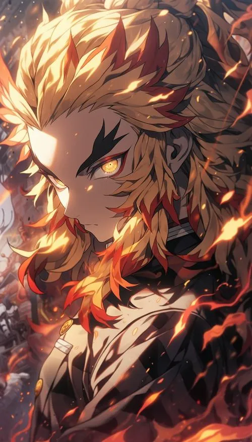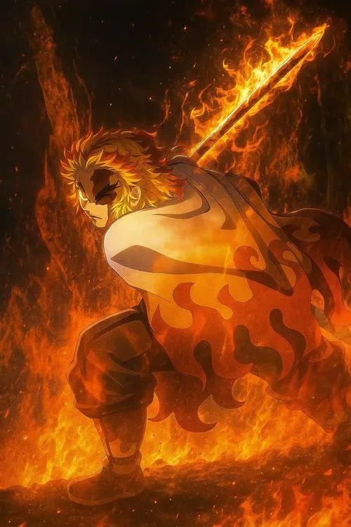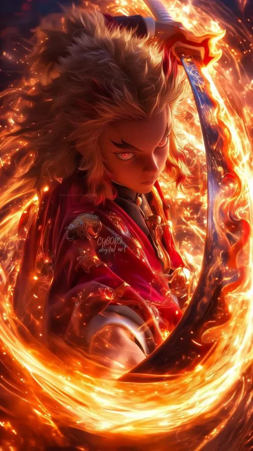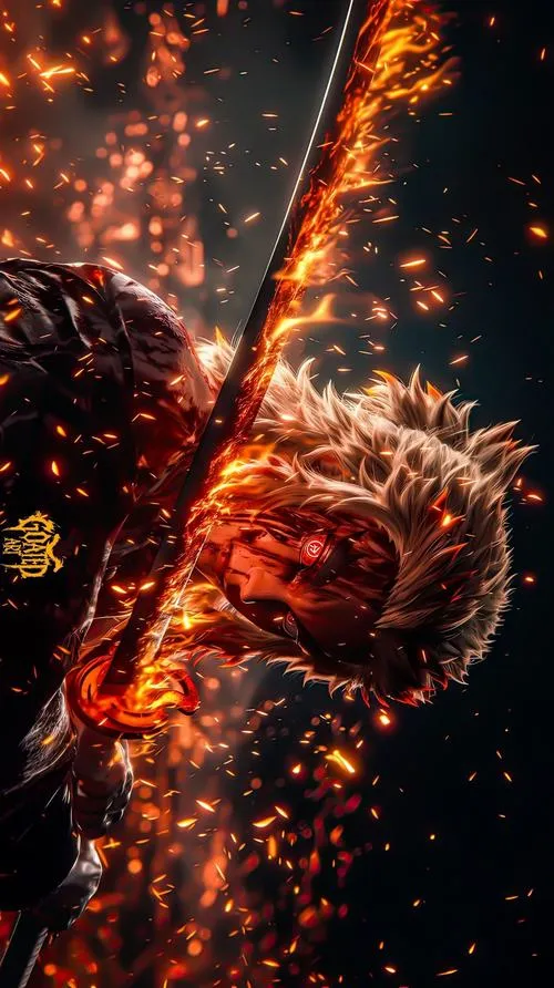Ảnh Rengoku Kyojuro thường nổi bật nhờ tương phản mạnh giữa nền tối và những mảng lửa đỏ cam vàng. Tóc và áo choàng tạo viền sáng như đang bùng lên, trong khi thanh kiếm kéo ánh nhìn về phía chuyển động. Những hạt tàn tro, khói bụi và vệt chém làm bức ảnh có chiều sâu, không bị phẳng. Điều thú vị là dù cảnh có kịch tính, gương mặt vẫn giữ sự điềm và tự tin, khiến tổng thể vừa dữ dội vừa trấn an.