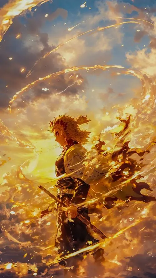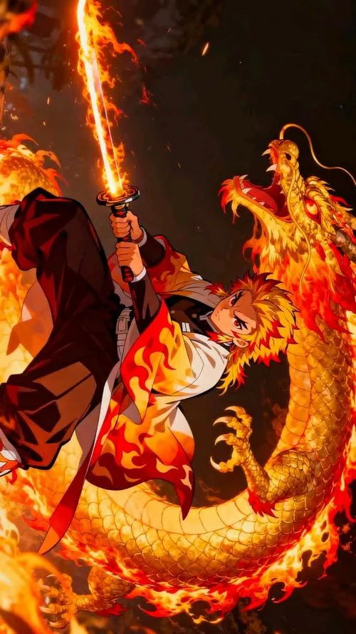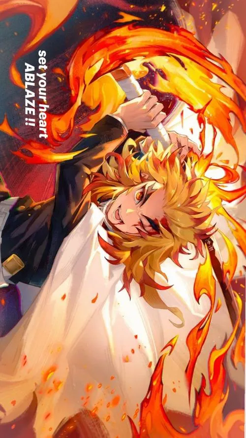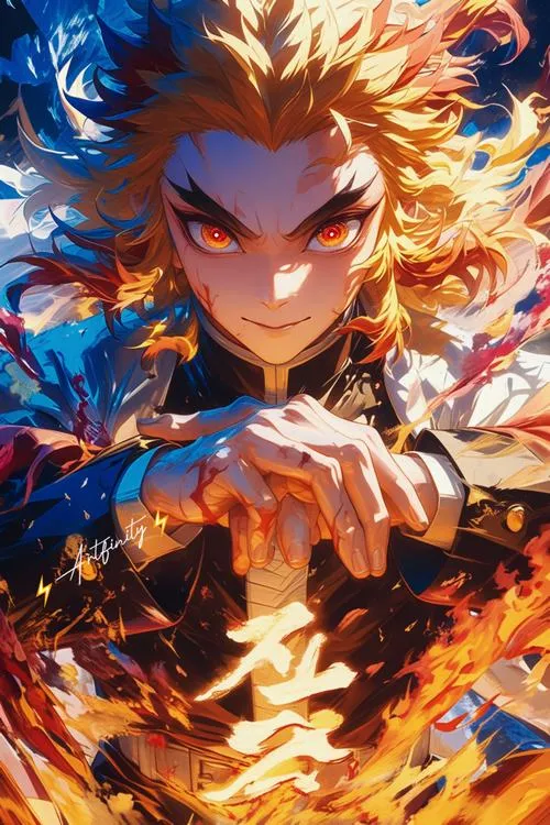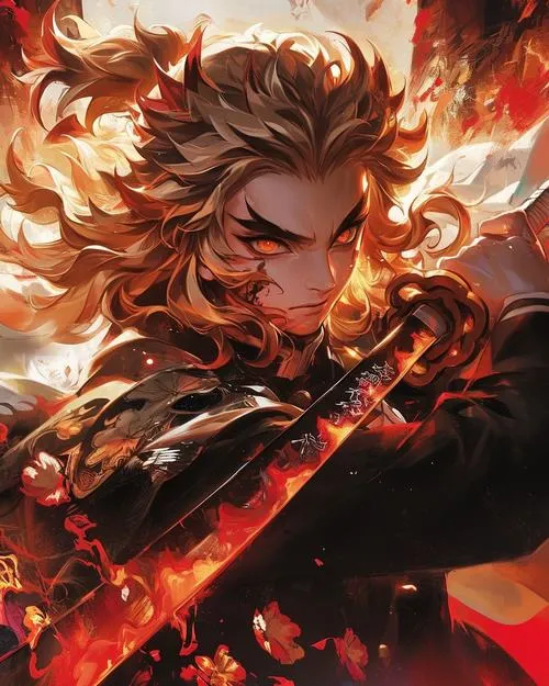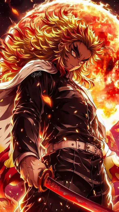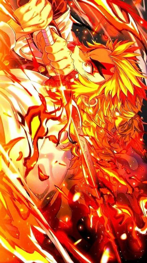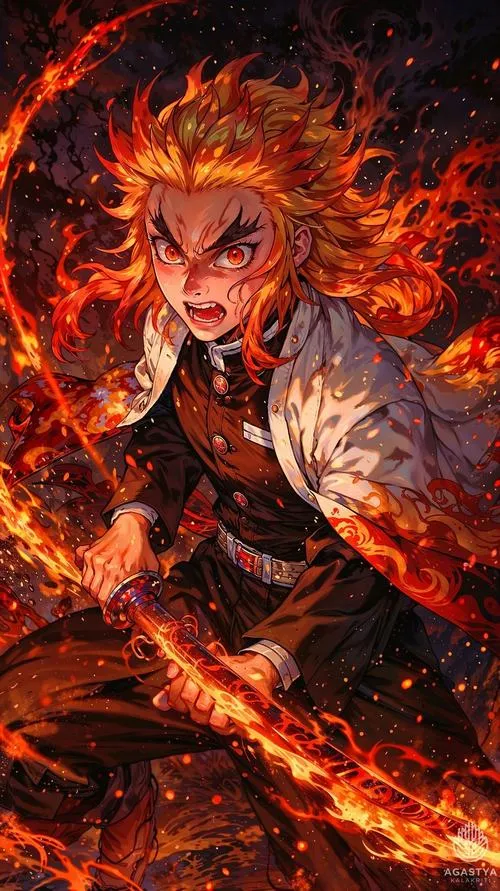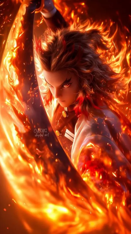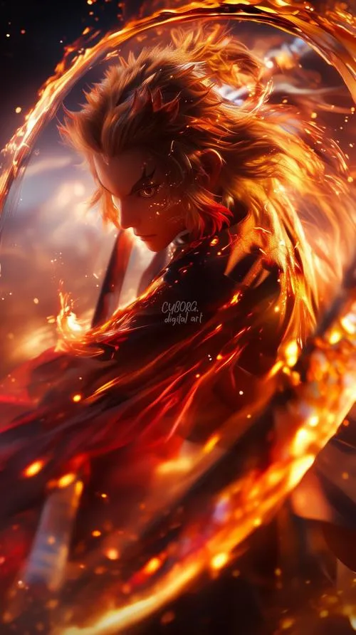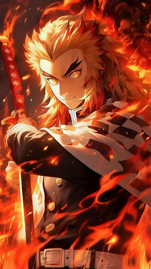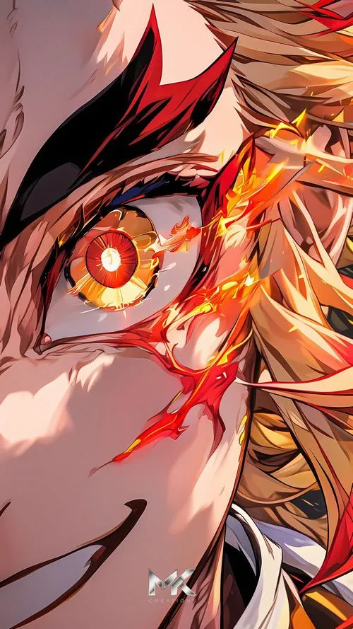 Ảnh Rengoku Kyojuro thường nổi bật nhờ tương phản mạnh giữa nền tối và những mảng lửa đỏ cam vàng. Tóc và áo choàng tạo viền sáng như đang bùng lên, trong khi thanh kiếm kéo ánh nhìn về phía chuyển động. Những hạt tàn tro, khói bụi và vệt chém làm bức ảnh có chiều sâu, không bị phẳng. Điều thú vị là dù cảnh có kịch tính, gương mặt vẫn giữ sự điềm và tự tin, khiến tổng thể vừa dữ dội vừa trấn an.