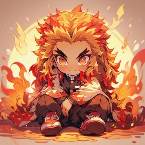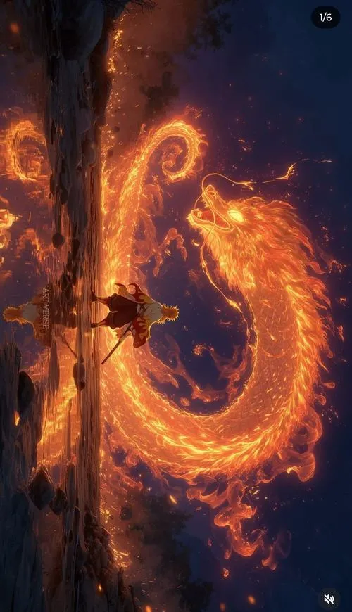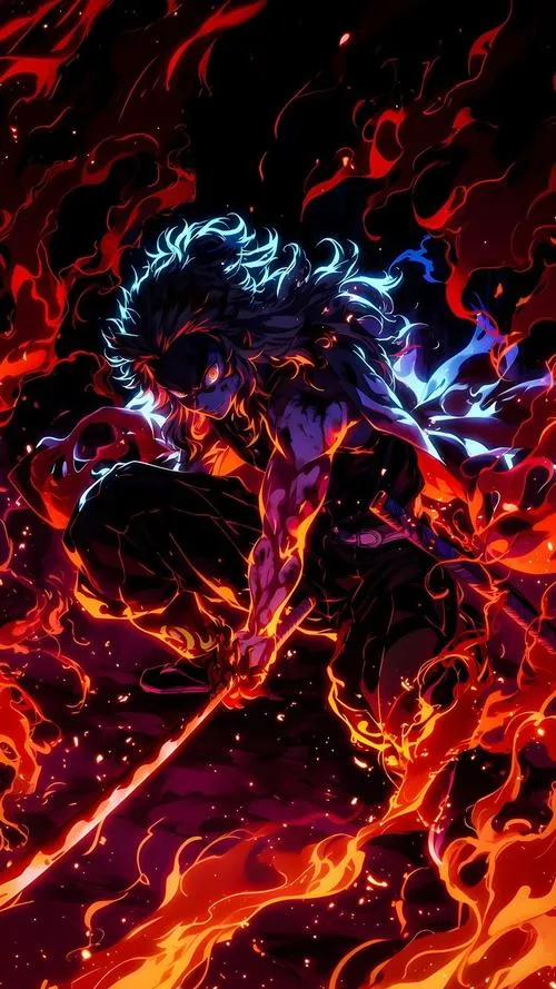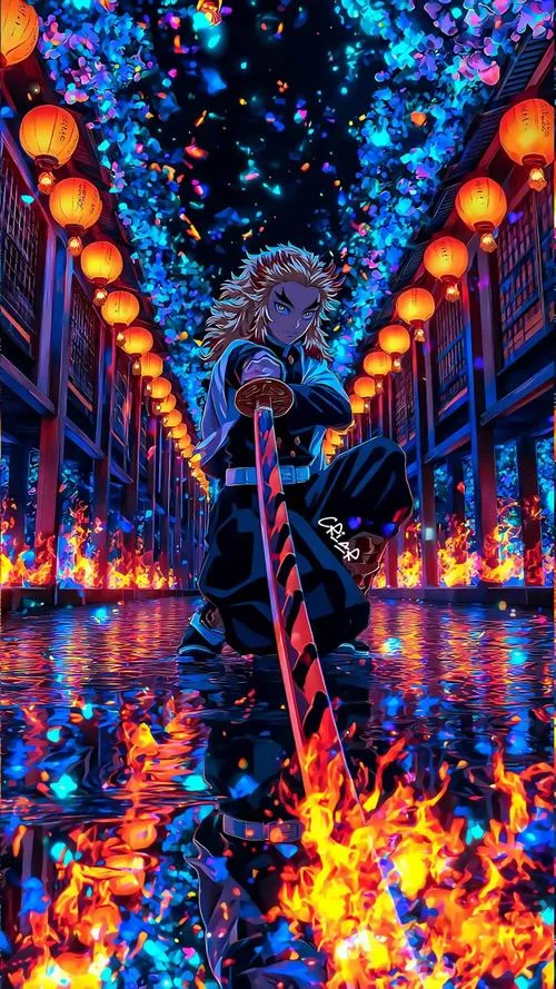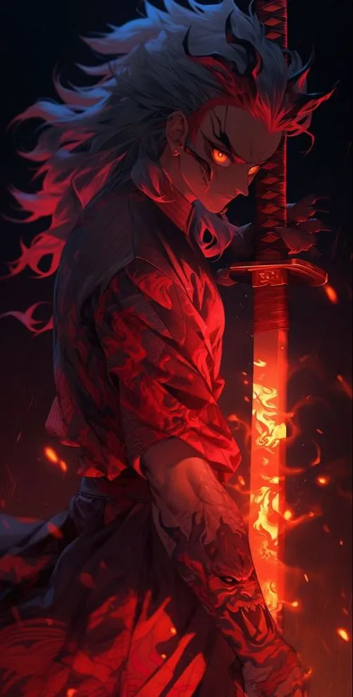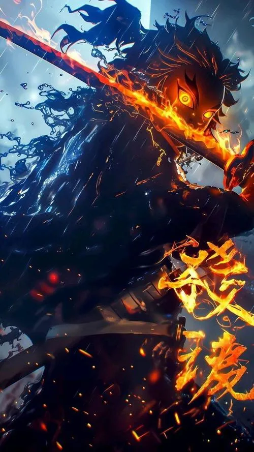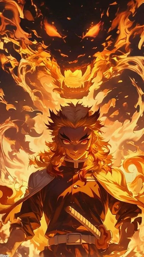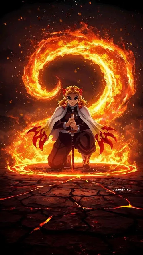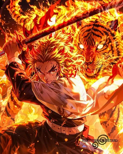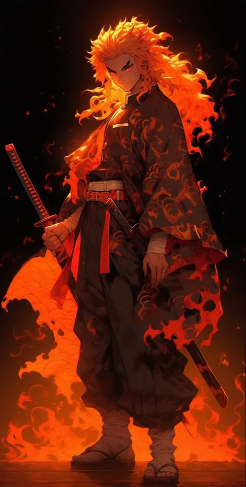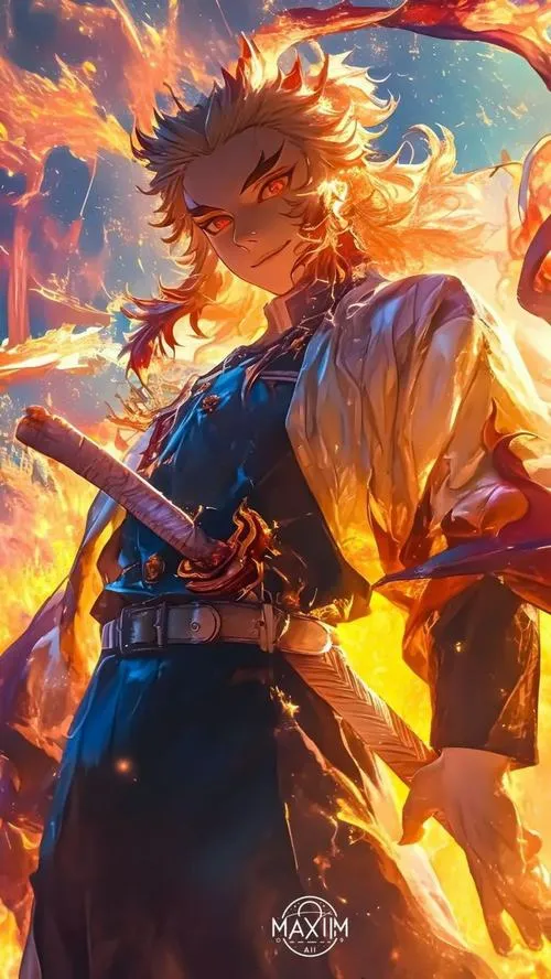 Ảnh Rengoku Kyojuro thường nổi bật nhờ tương phản mạnh giữa nền tối và những mảng lửa đỏ cam vàng. Tóc và áo choàng tạo viền sáng như đang bùng lên, trong khi thanh kiếm kéo ánh nhìn về phía chuyển động. Những hạt tàn tro, khói bụi và vệt chém làm bức ảnh có chiều sâu, không bị phẳng. Điều thú vị là dù cảnh có kịch tính, gương mặt vẫn giữ sự điềm và tự tin, khiến tổng thể vừa dữ dội vừa trấn an.