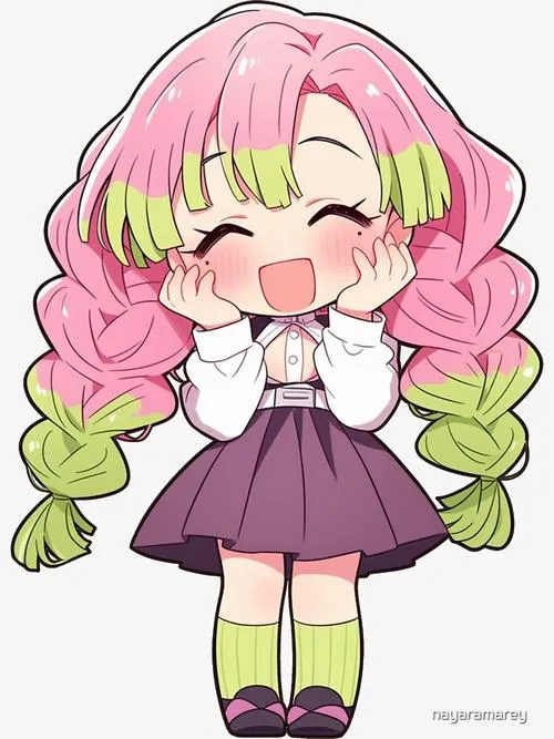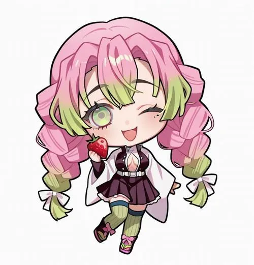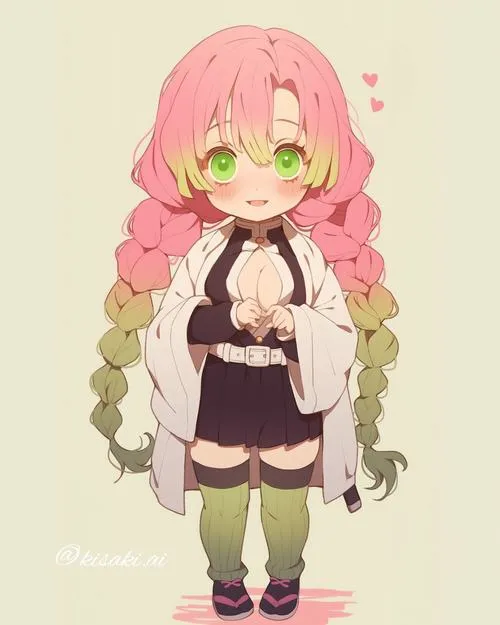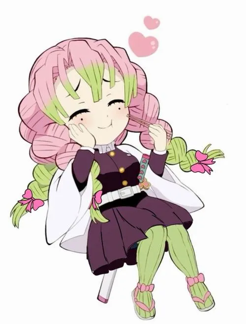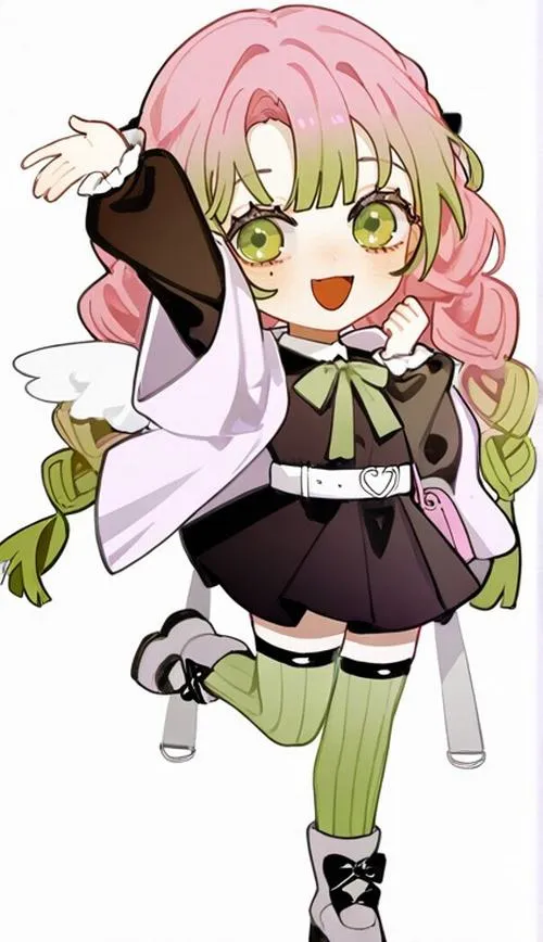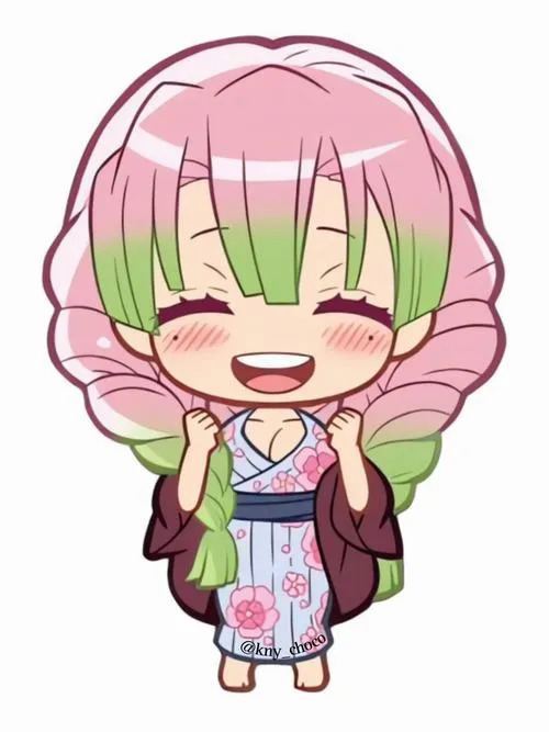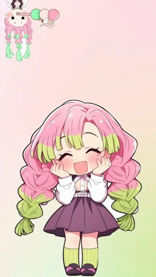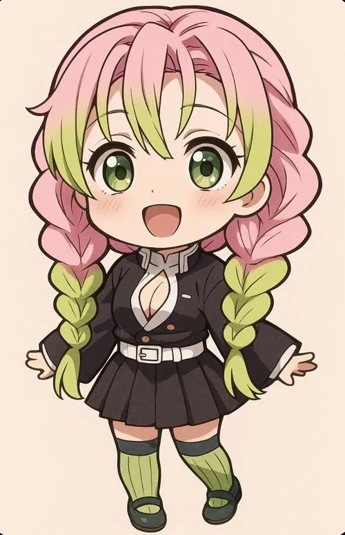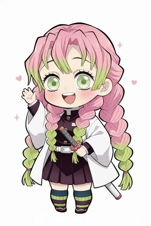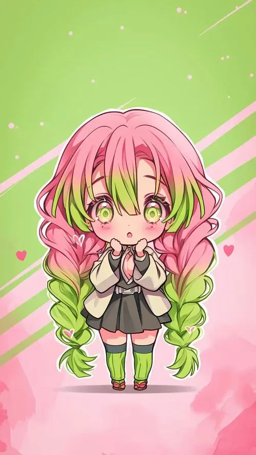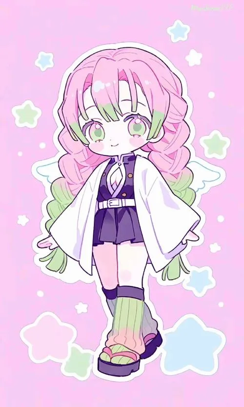 Ảnh Mitsuri chibi thường gây ấn tượng ngay từ tỉ lệ đặc trưng: đầu lớn, thân nhỏ, tay chân ngắn gọn. Khuôn mặt tròn, má hồng, nụ cười hiền kết hợp đôi mắt to phản sáng tạo cảm giác ấm áp. Tóc hồng xanh bồng bềnh là điểm nhấn, đi cùng đồng phục Sát Quỷ Đoàn và haori trắng khiến nhân vật vừa đúng “chất” vừa mềm mại. Nền pastel hoặc họa tiết tim càng làm tổng thể nhẹ nhàng.