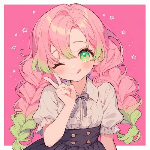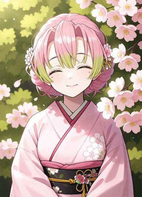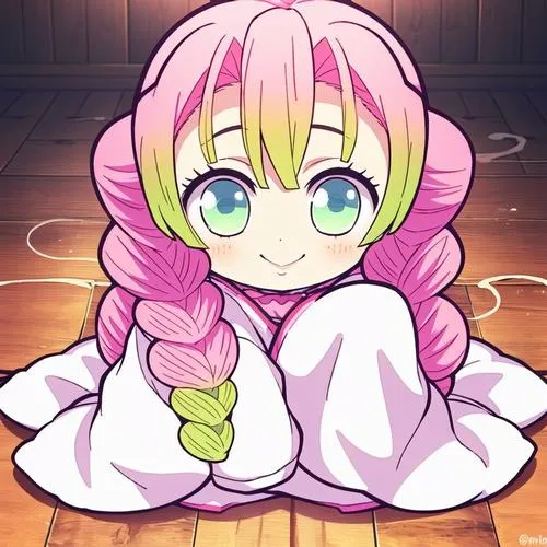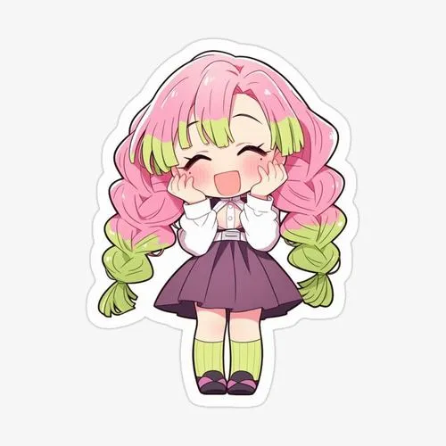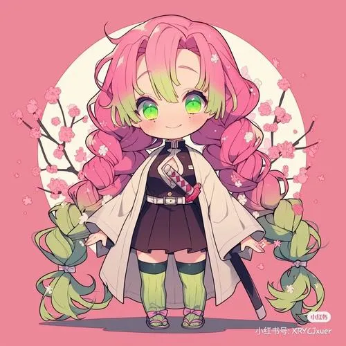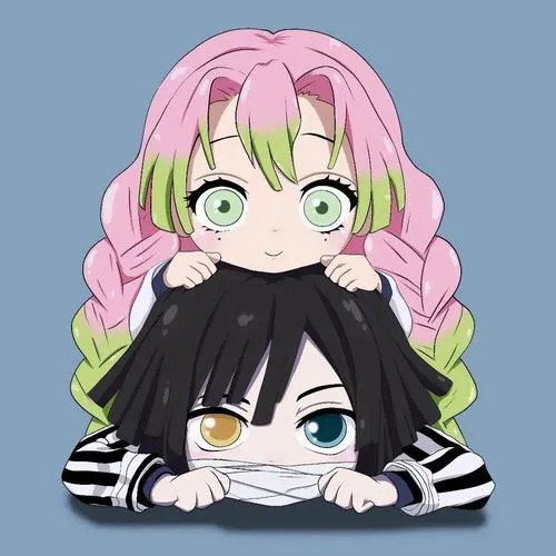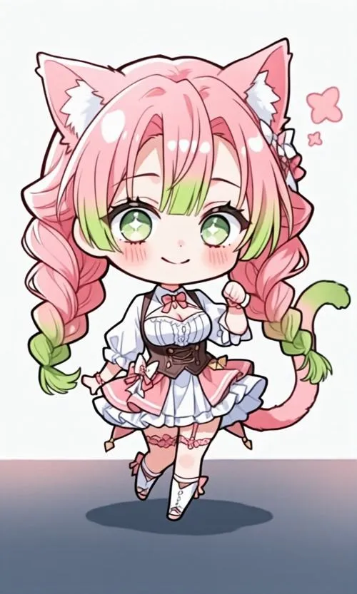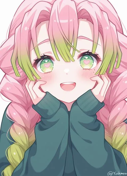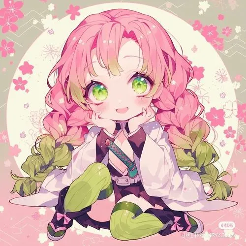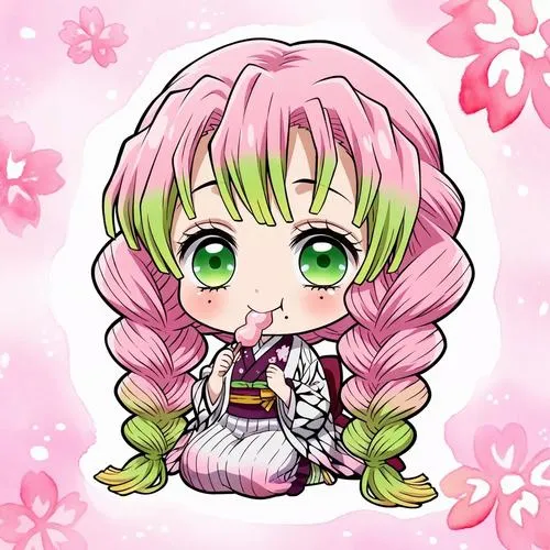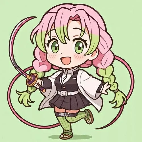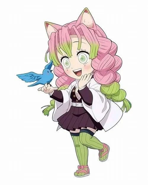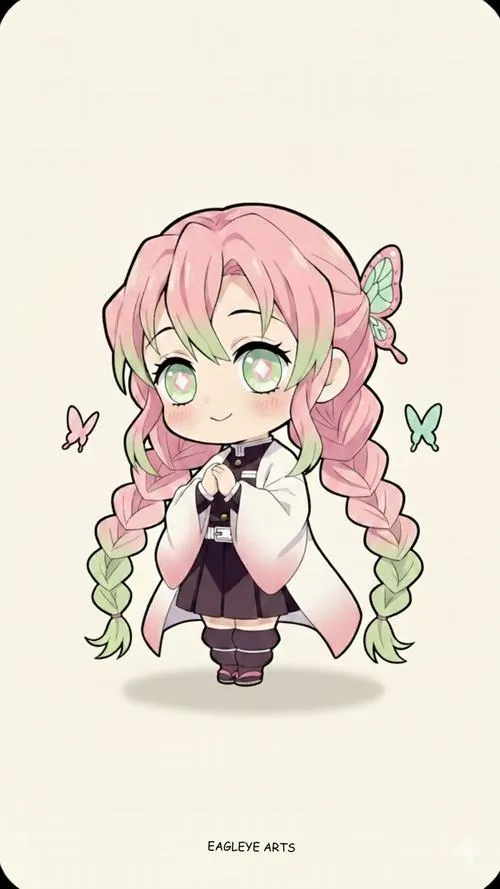 Ảnh Mitsuri chibi thường gây ấn tượng ngay từ tỉ lệ đặc trưng: đầu lớn, thân nhỏ, tay chân ngắn gọn. Khuôn mặt tròn, má hồng, nụ cười hiền kết hợp đôi mắt to phản sáng tạo cảm giác ấm áp. Tóc hồng xanh bồng bềnh là điểm nhấn, đi cùng đồng phục Sát Quỷ Đoàn và haori trắng khiến nhân vật vừa đúng “chất” vừa mềm mại. Nền pastel hoặc họa tiết tim càng làm tổng thể nhẹ nhàng.