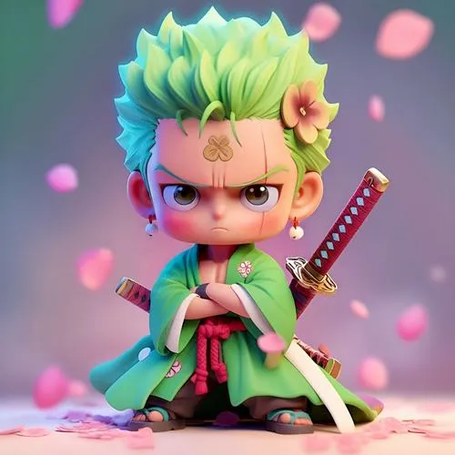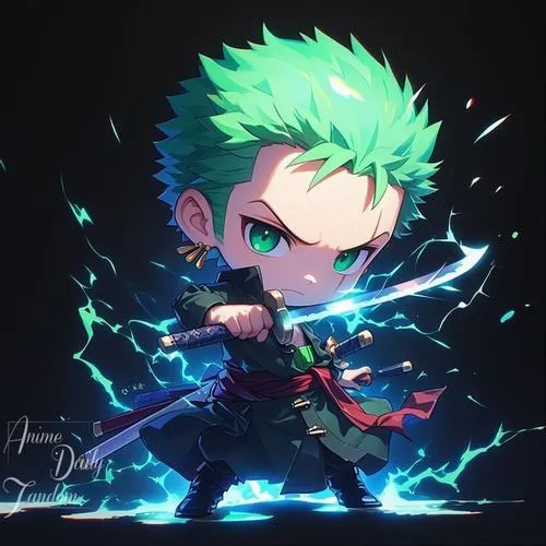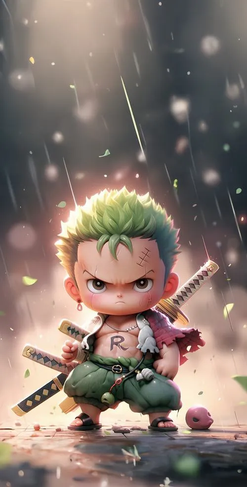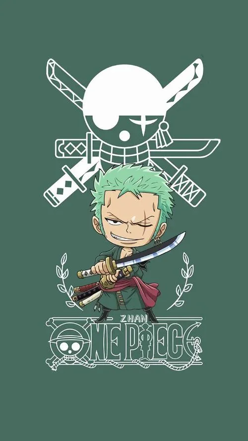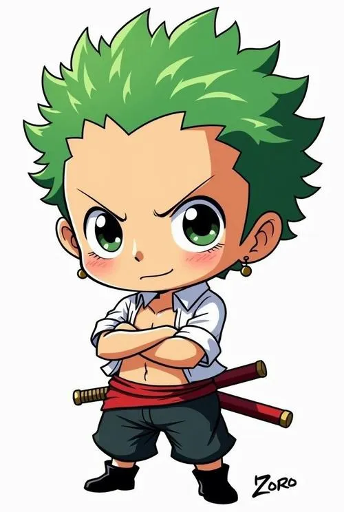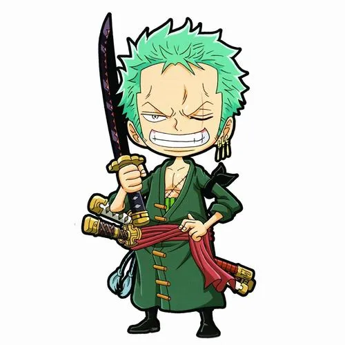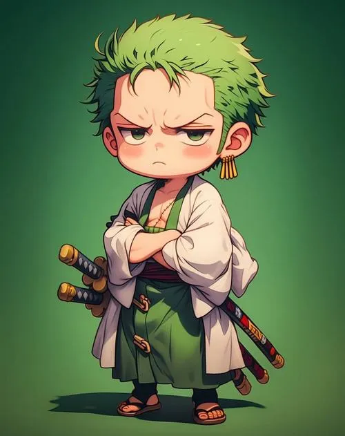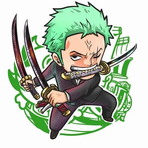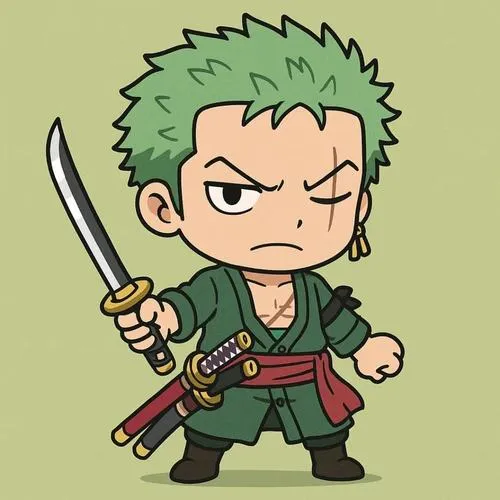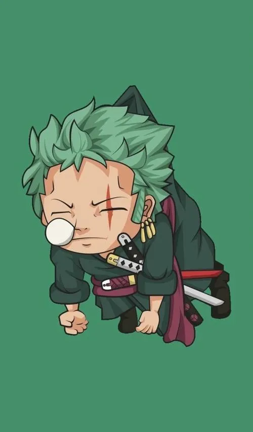 Zoro chibi là kiểu nhìn một phát là dính. Nhỏ xíu mà thần thái vẫn cứng, mặt lạnh như muốn “đấu” với cả thế giới, nhưng lại đáng yêu vì đầu to với má tròn. Tóc xanh rêu dựng dựng, bandana xanh, thêm ba thanh kiếm là đúng bài. Dùng làm avatar thì chất, làm sticker thì hài, để hình nền cũng ổn vì nền thường tối giản, không rối mắt.