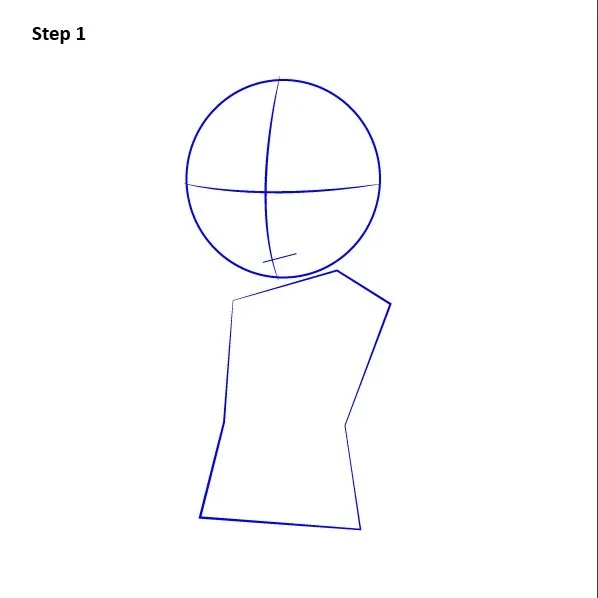 Bước 1: Vẽ một hình tròn làm đầu, rồi kẻ trục dọc và ngang để canh hướng mặt. Phác nhẹ cổ và khối thân trên dạng hình thang nhỏ, giữ tỉ lệ đầu hơi lớn cho đúng phong cách.