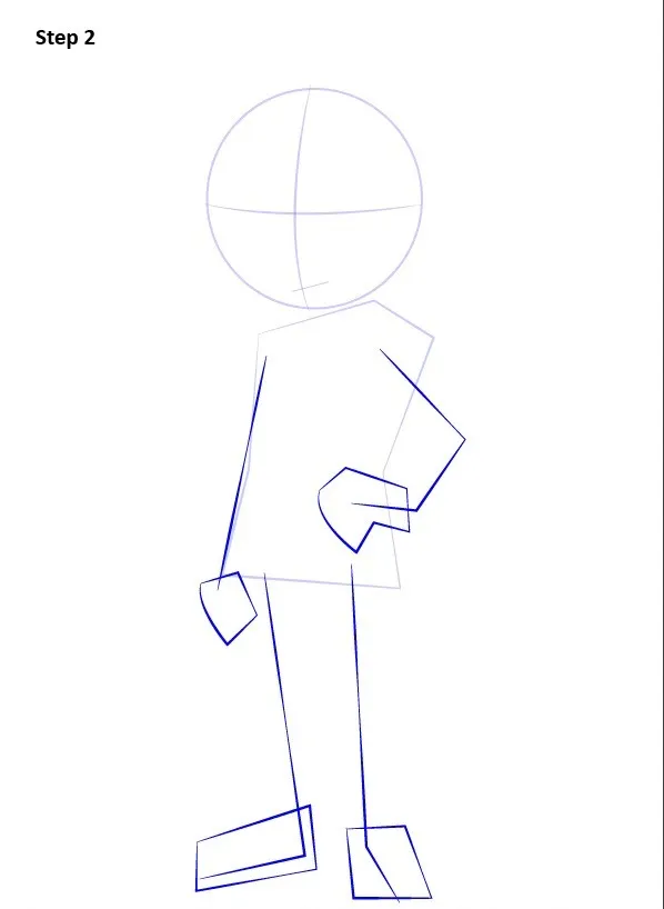 Bước 2: Từ vai, dựng khung xương tay bằng hai đoạn thẳng, chừa vị trí khuỷu tay rõ ràng. Chân vẽ bằng đường thẳng đơn giản, đánh dấu gối và mắt cá, đặt bàn chân theo hướng đứng tự nhiên.