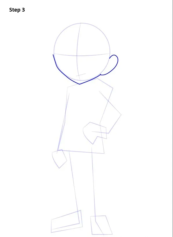 Bước 3: Tạo cằm bằng đường cong mềm, không nhọn quá để giữ nét thiếu niên. Vẽ tai theo vị trí ngang tầm mắt và mũi, thêm đường trong tai vừa đủ, tránh nhiều chi tiết.
