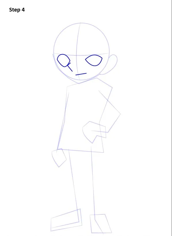 Bước 4: Phác khung mắt to hình oval, canh hai mắt cùng độ cao theo trục ngang. Mũi chỉ cần chấm nhỏ hoặc nét ngắn. Miệng mảnh, hơi cong nhẹ để ra vẻ bình tĩnh.