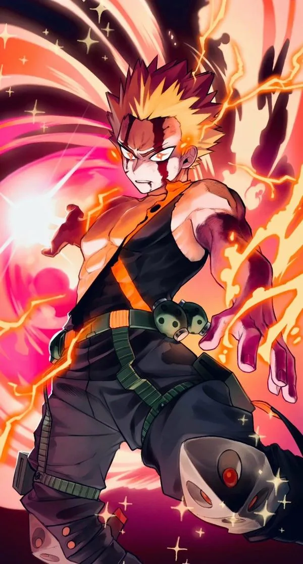 Hình ảnh Bakugo Katsuki giống một chiếc loa mở âm lượng lớn, vừa xuất hiện là bầu không khí đổi màu. Khung hình nào cũng có cảm giác nóng, tông cam đỏ như lửa, chi tiết kim loại và găng tay lựu đạn như sẵn sàng kích nổ. So với nhiều nhân vật khác, Bakugo không cần đứng giữa trung tâm vẫn chiếm spotlight, vì thần thái hiếu thắng kéo mắt người xem lại ngay lập tức.