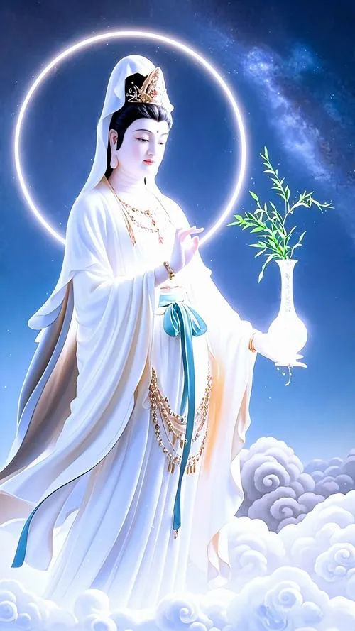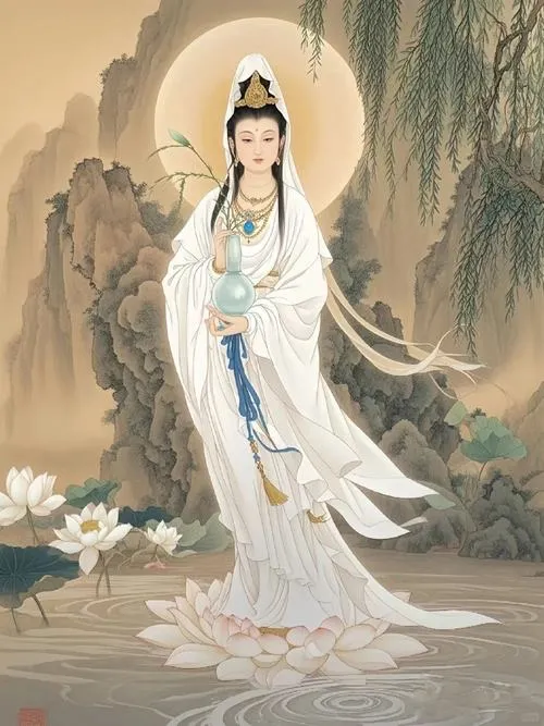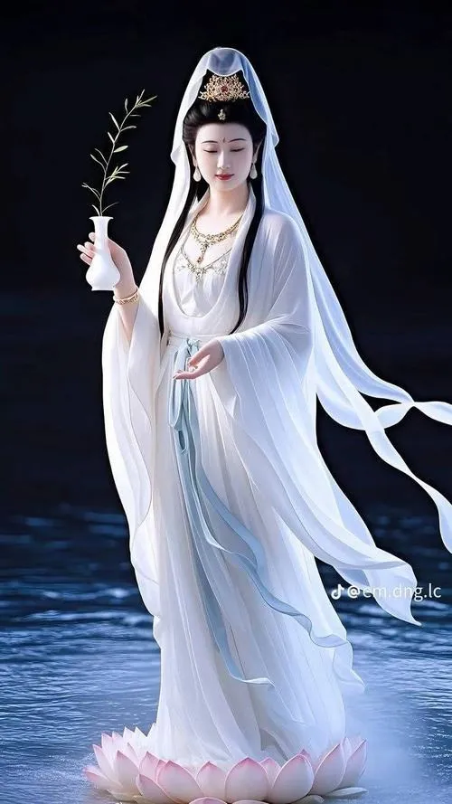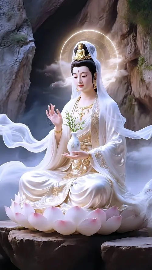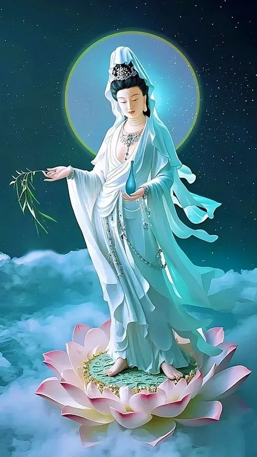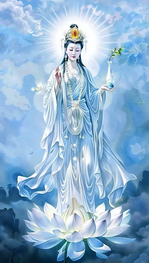 Hình ảnh phật Quan Âm Bồ Tát là các bức tranh, ảnh thờ hoặc ảnh nghệ thuật khắc họa hình tượng Quan Thế Âm với nét mặt hiền hòa, dáng đứng hoặc ngồi trên đài sen, thường kèm tịnh bình cam lồ và cành dương liễu.