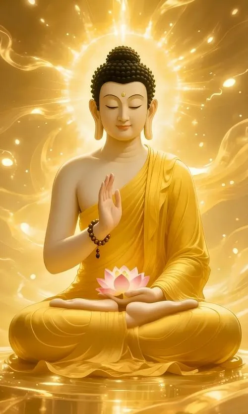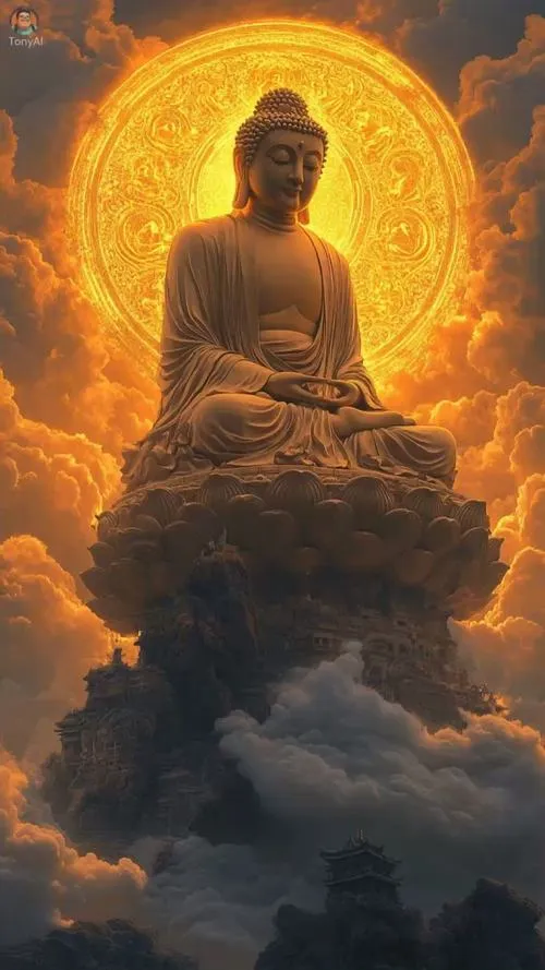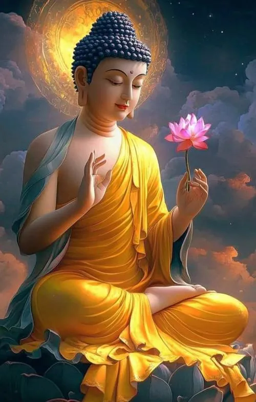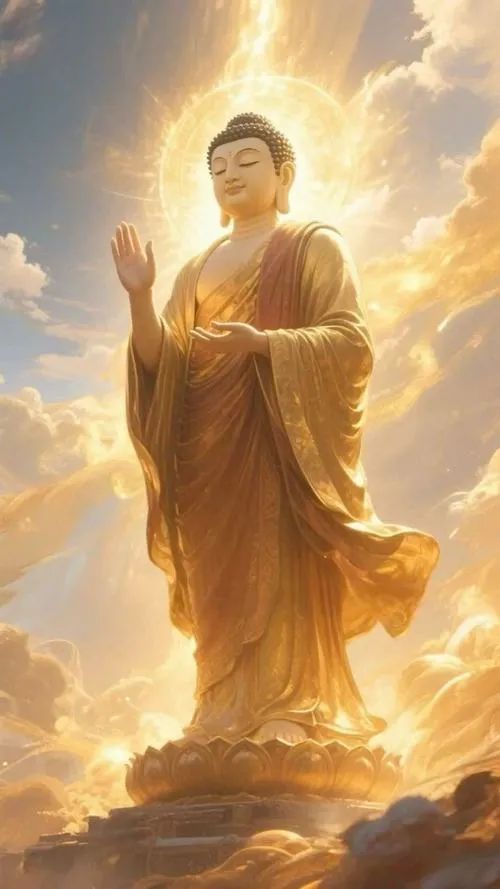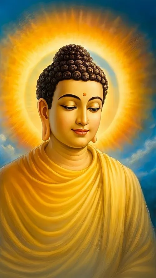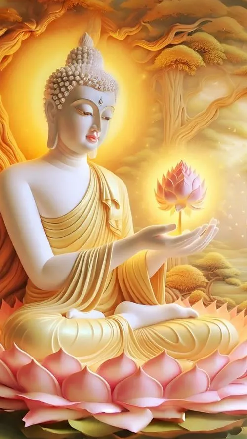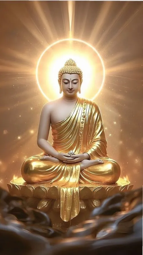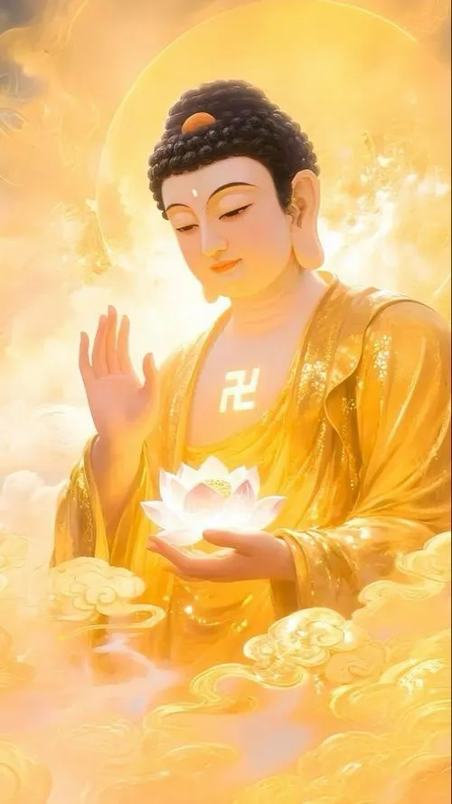 Sắc vàng ấm trên áo cà sa, hào quang rực nhẹ như lớp sương mỏng, tòa sen đặt vững ở trung tâm. Ảnh phật Thích Ca Mâu Ni thường không cần nhiều chi tiết ồn ào, nhưng lại giữ người xem ở lại bằng một thần thái điềm tĩnh. Chỉ một khoảng sáng dịu rơi lên gương mặt, bối cảnh chùa trầm, khói hương mỏng, là đủ tạo ra cảm giác trang nghiêm và thanh tịnh.
