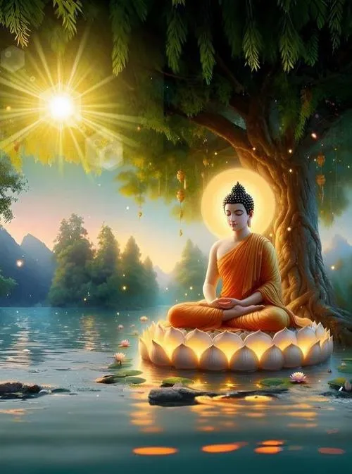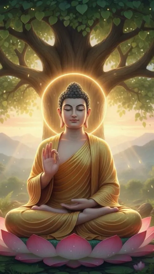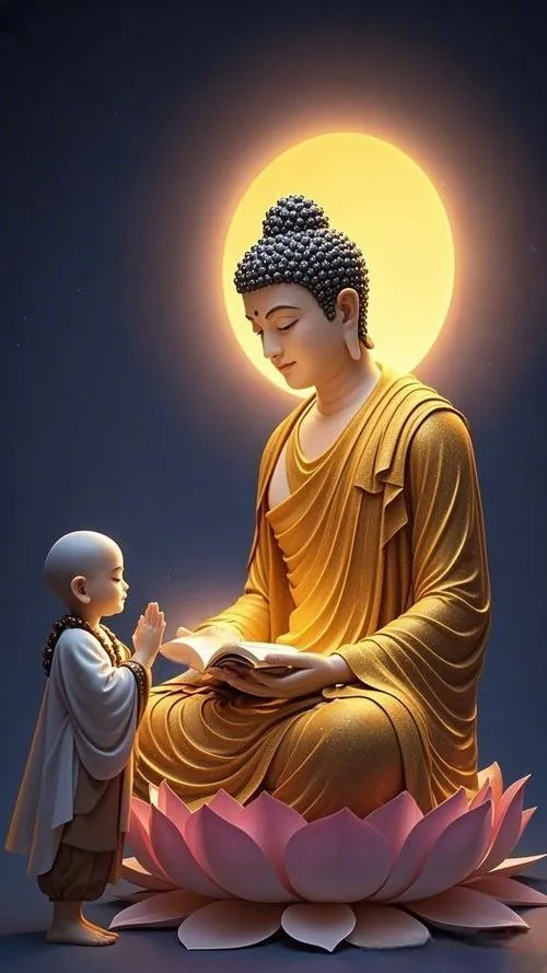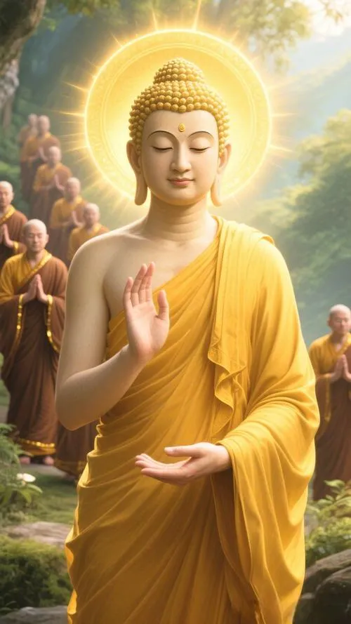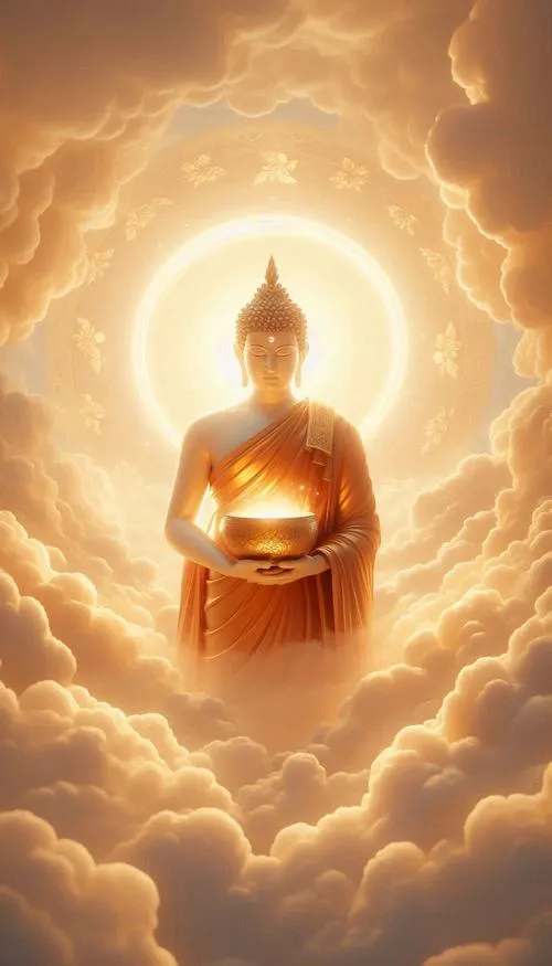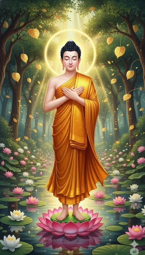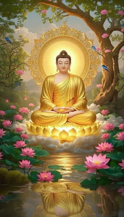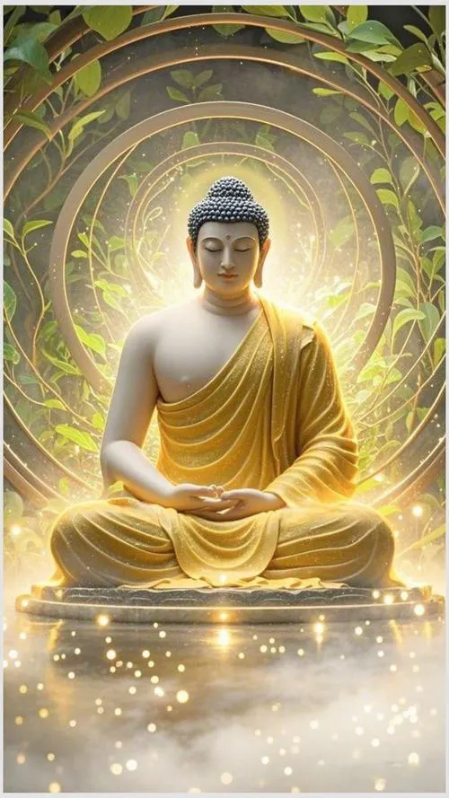 Sắc vàng ấm trên áo cà sa, hào quang rực nhẹ như lớp sương mỏng, tòa sen đặt vững ở trung tâm. Ảnh phật Thích Ca Mâu Ni thường không cần nhiều chi tiết ồn ào, nhưng lại giữ người xem ở lại bằng một thần thái điềm tĩnh. Chỉ một khoảng sáng dịu rơi lên gương mặt, bối cảnh chùa trầm, khói hương mỏng, là đủ tạo ra cảm giác trang nghiêm và thanh tịnh.