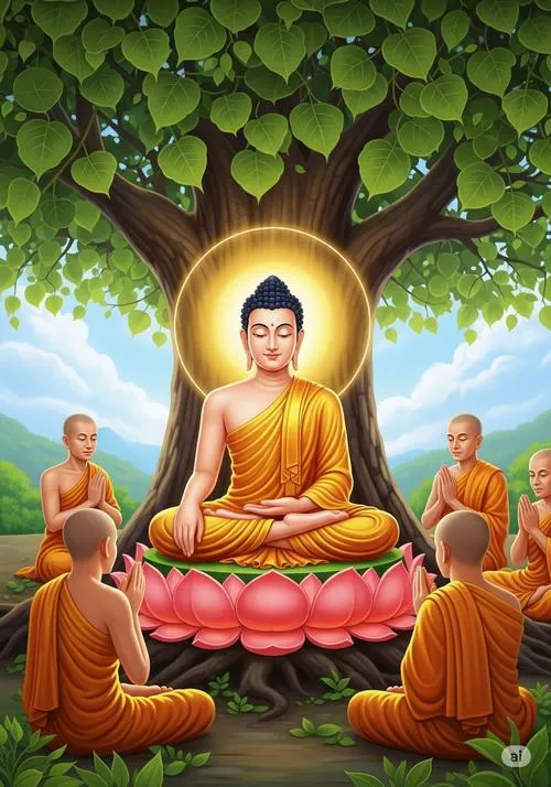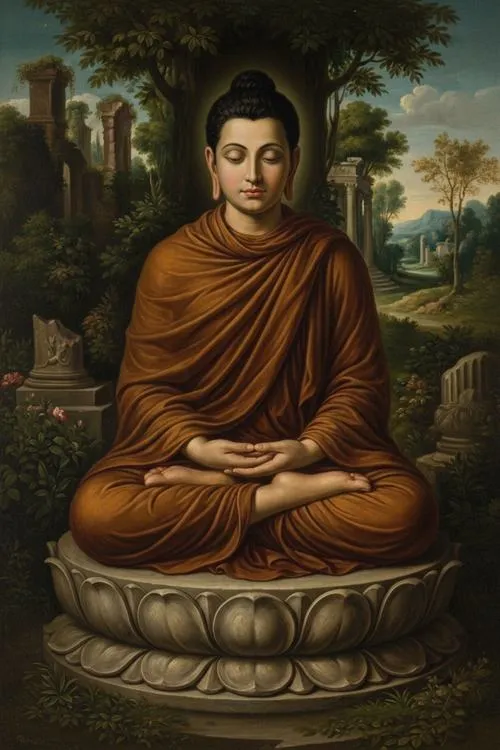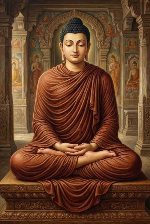 Màu sắc hay gặp là vàng ấm, nâu trầm, đỏ son, đôi khi có xanh ngọc để tạo chiều sâu. Loại ảnh này hợp với không gian cần sự trang nghiêm, truyền cảm giác thanh tịnh và tỉnh thức.