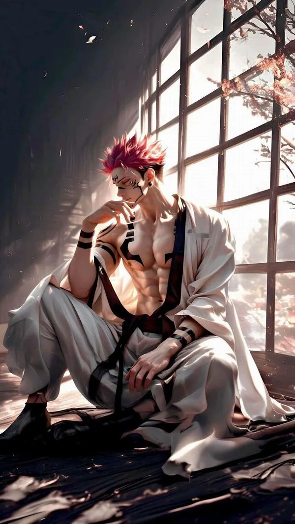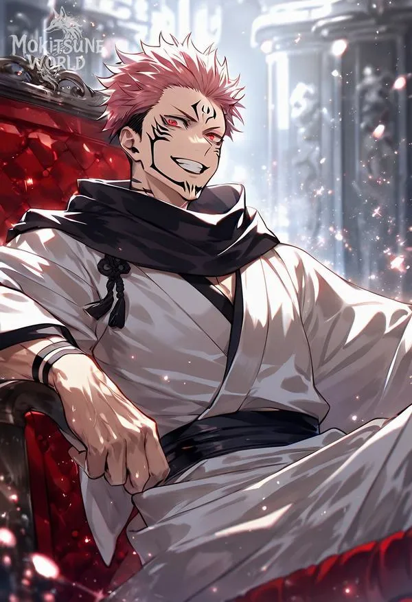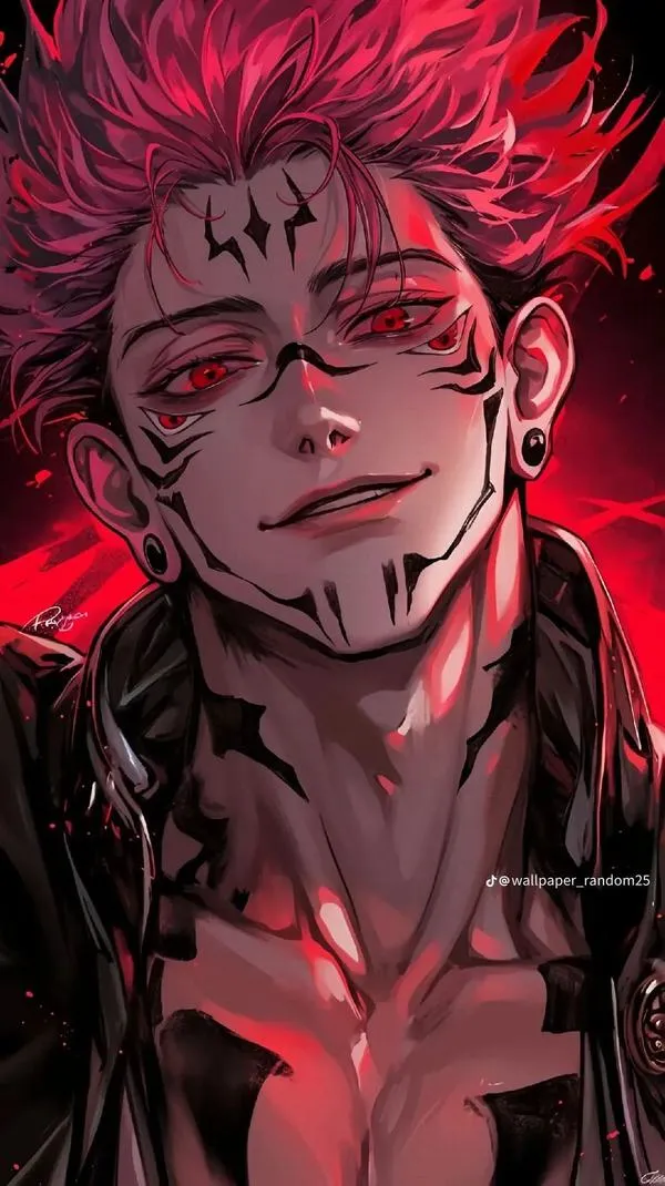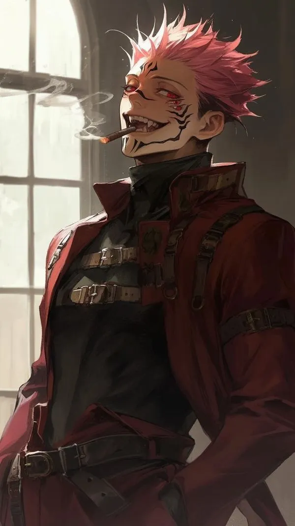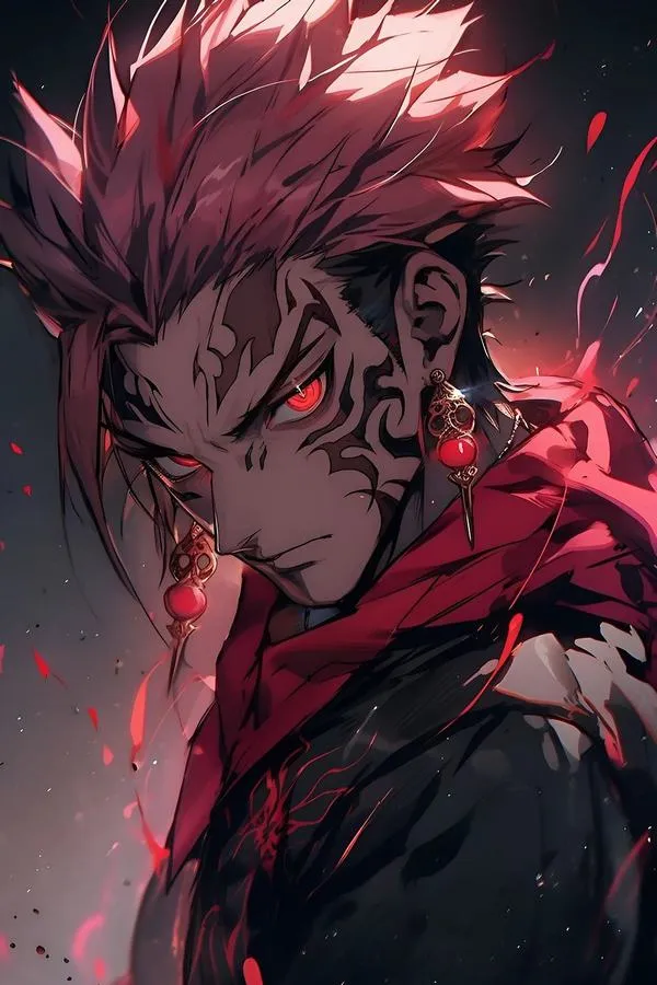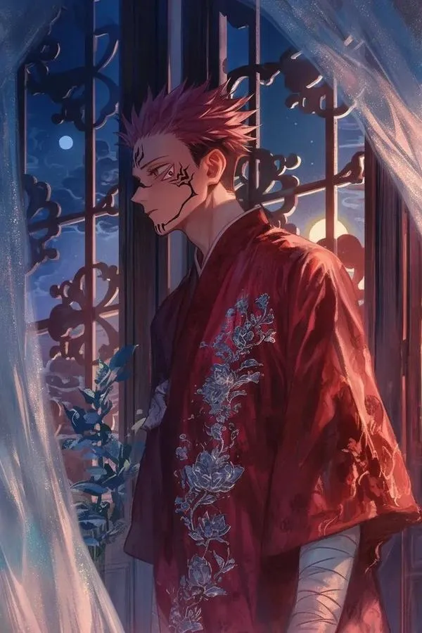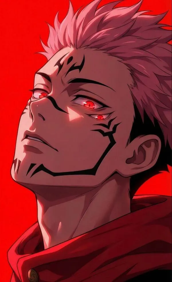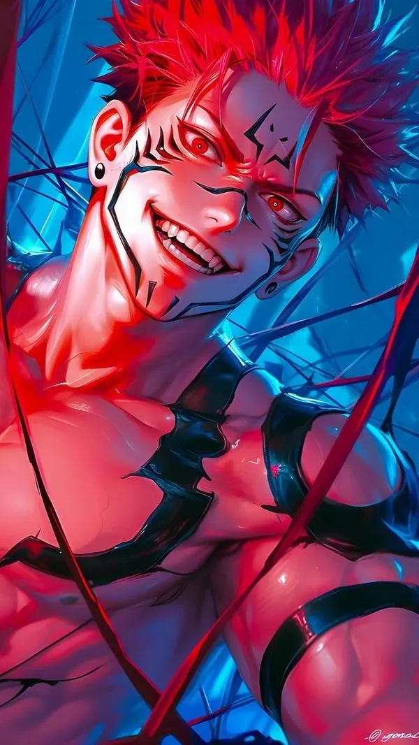 Ánh đỏ phủ nền, bóng tối bóp chặt không khí, hình ảnh Ryomen Sukuna hiện ra với cơ thể lực lưỡng và các đường vằn đen như dấu ấn tội lỗi. Một khung hình chuẩn chỉ thường bắt được cảm giác áp đảo: kimono sáng màu tương phản, khăn cổ đen gọn, ánh nhìn lạnh và tư thế sẵn sàng cắt nát mọi thứ. Đó là kiểu ảnh nhìn một lần là khó quên.