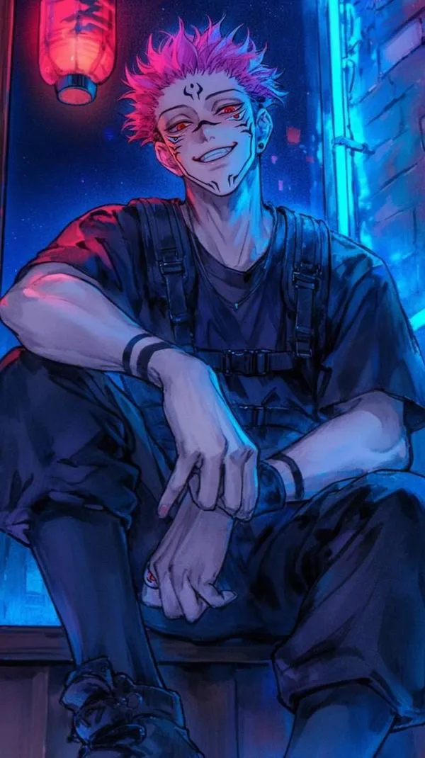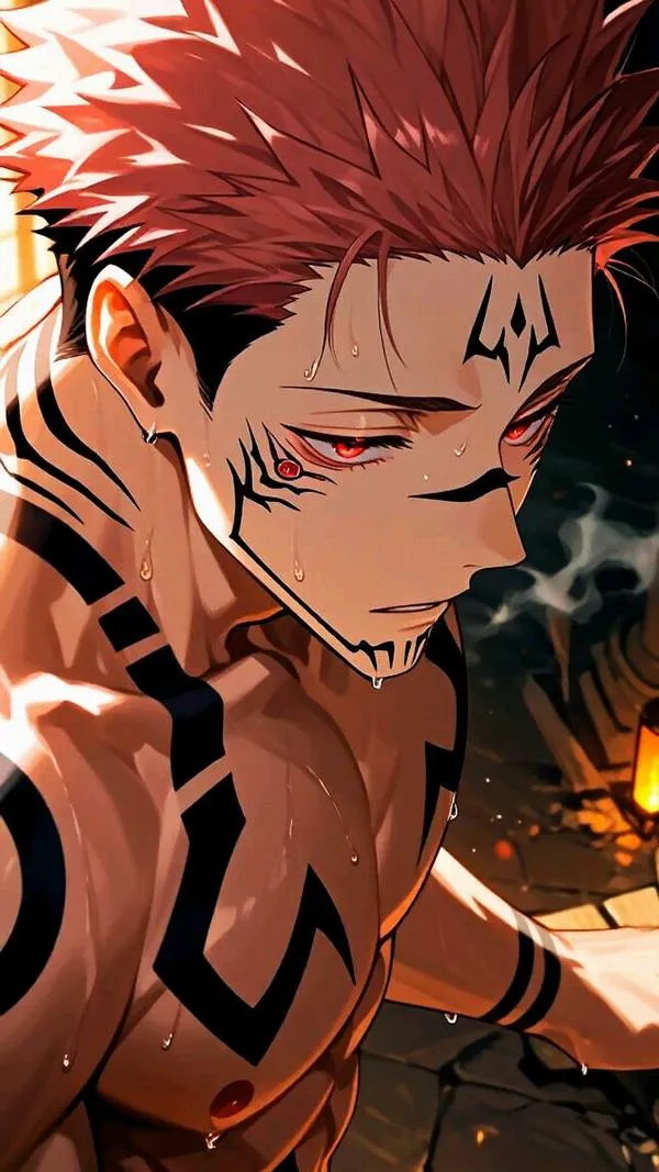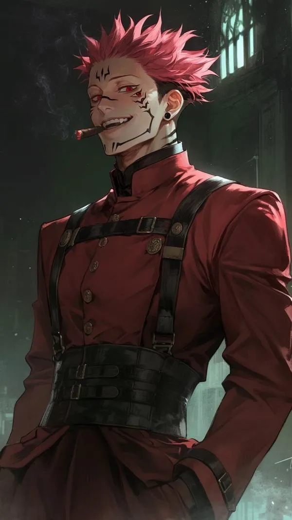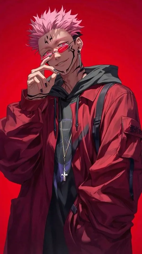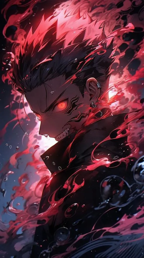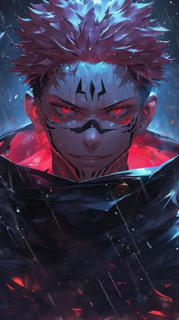 Ánh đỏ phủ nền, bóng tối bóp chặt không khí, hình ảnh Ryomen Sukuna hiện ra với cơ thể lực lưỡng và các đường vằn đen như dấu ấn tội lỗi. Một khung hình chuẩn chỉ thường bắt được cảm giác áp đảo: kimono sáng màu tương phản, khăn cổ đen gọn, ánh nhìn lạnh và tư thế sẵn sàng cắt nát mọi thứ. Đó là kiểu ảnh nhìn một lần là khó quên.