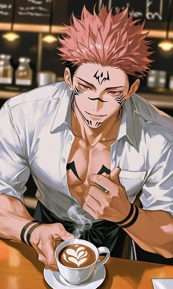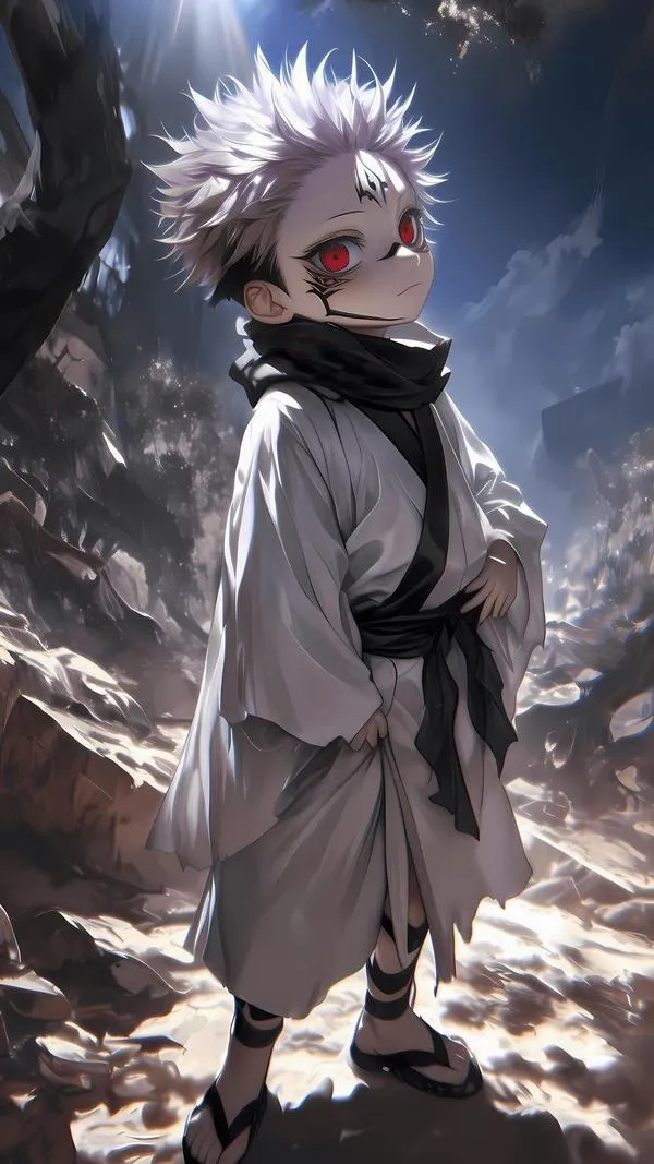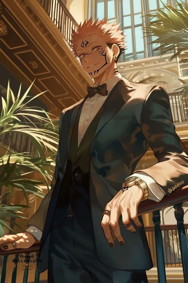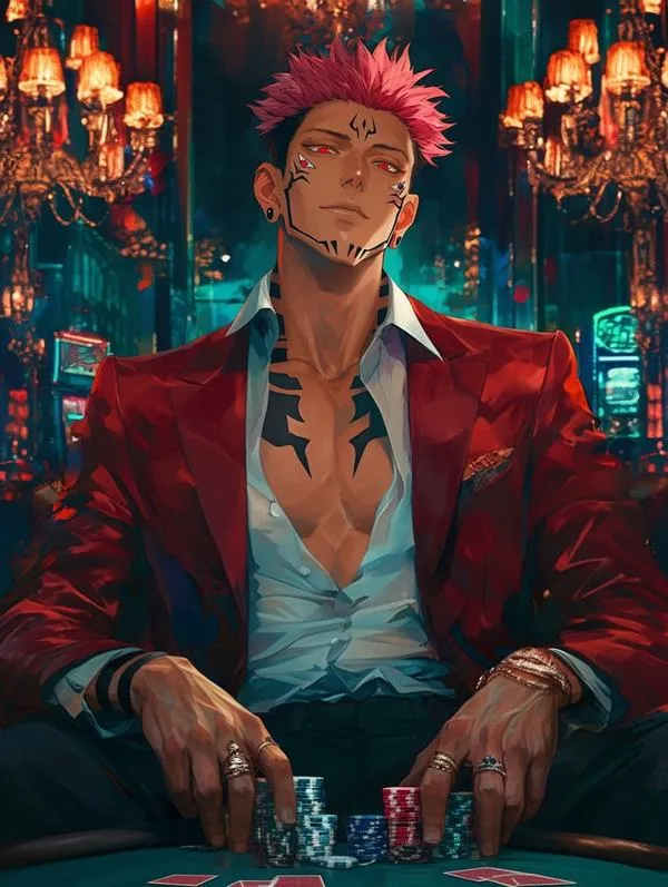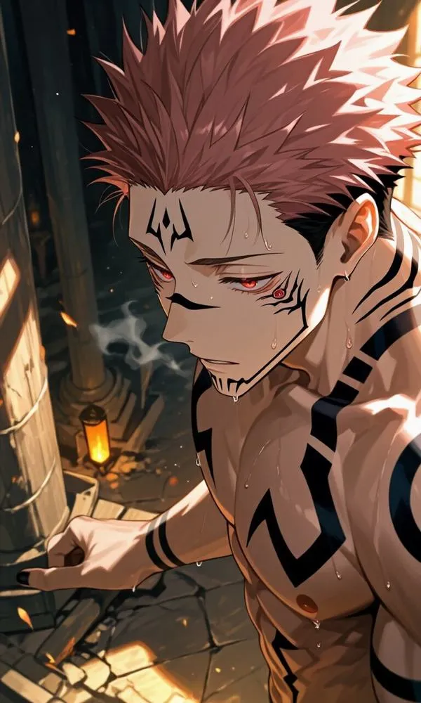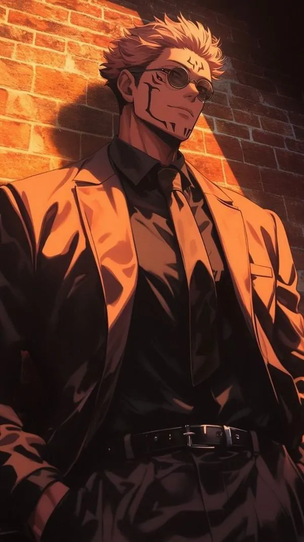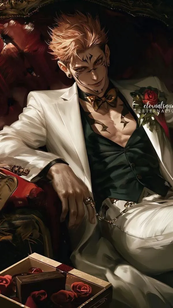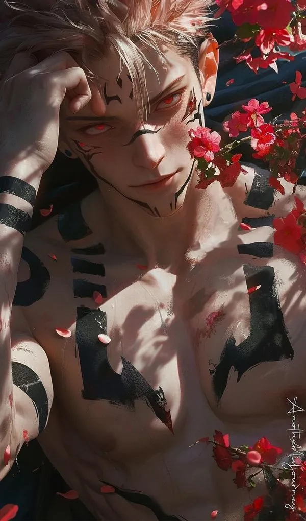 Ánh đỏ phủ nền, bóng tối bóp chặt không khí, hình ảnh Ryomen Sukuna hiện ra với cơ thể lực lưỡng và các đường vằn đen như dấu ấn tội lỗi. Một khung hình chuẩn chỉ thường bắt được cảm giác áp đảo: kimono sáng màu tương phản, khăn cổ đen gọn, ánh nhìn lạnh và tư thế sẵn sàng cắt nát mọi thứ. Đó là kiểu ảnh nhìn một lần là khó quên.