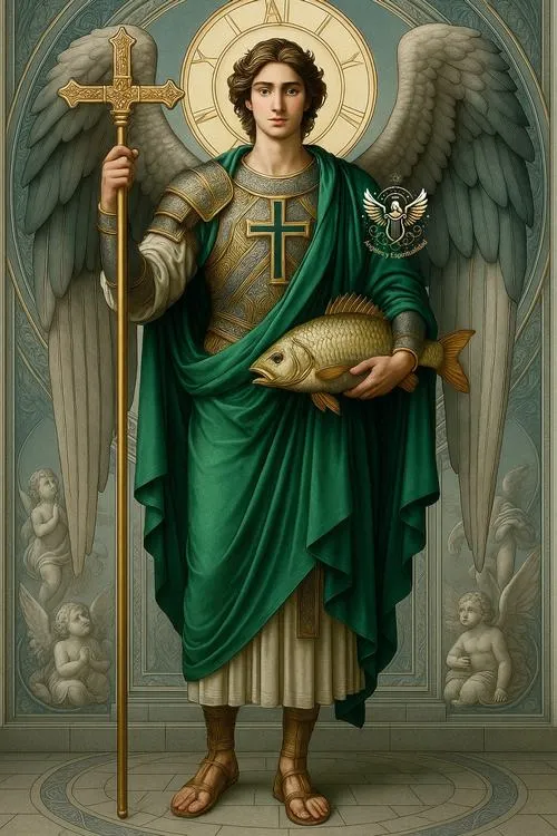 Tổng lãnh thiên thần Raphael giữa mây trắng và bầu trời thiêng liêng