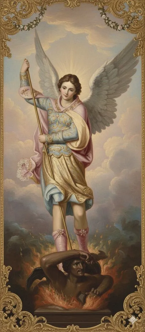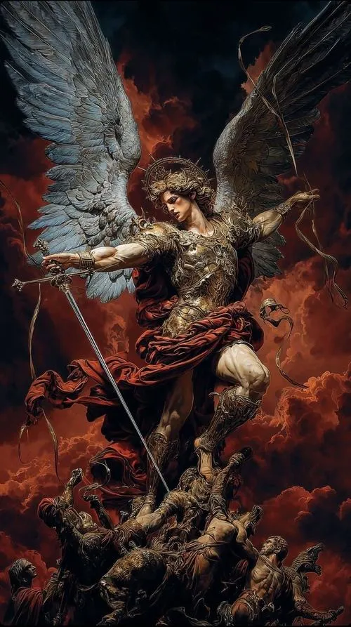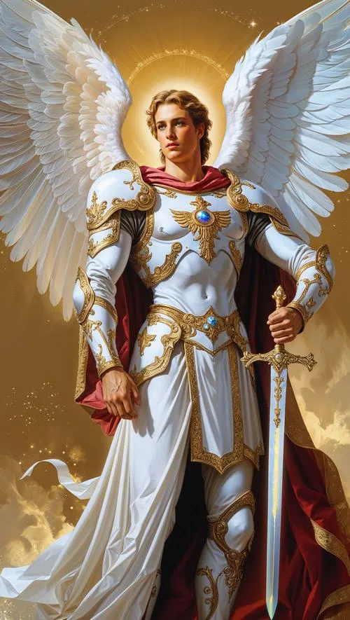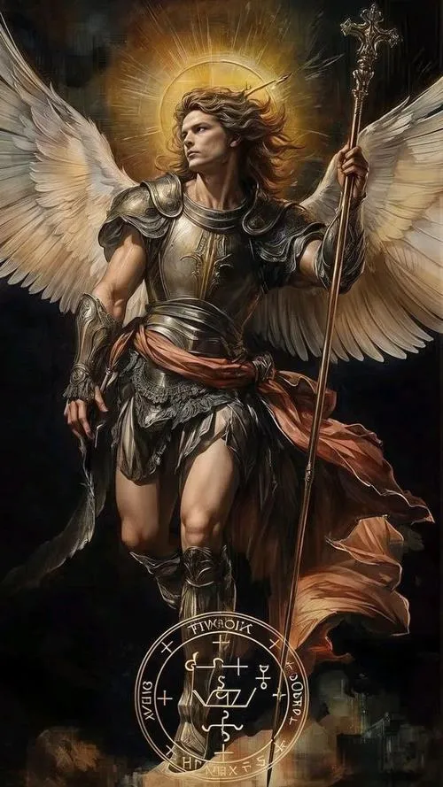 Tổng lãnh thiên thần Michael đứng giữa ánh sáng rực và hào quang