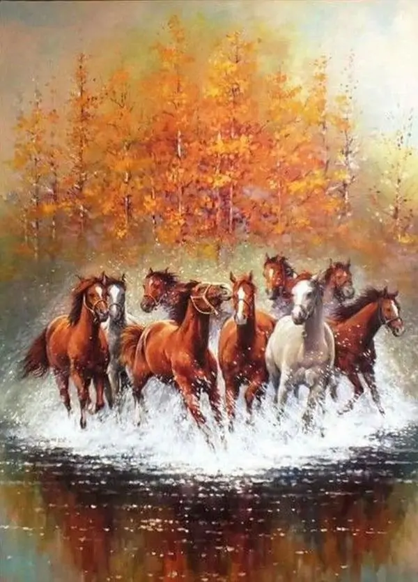 - Nhân vật chính: Tám con ngựa khỏe mạnh với cơ bắp cuồn cuộn, bờm và đuôi tung bay theo gió.