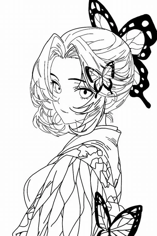 - Shinobu tông tím nhạt, áo choàng cánh bướm viền xanh hồng, tóc đen tím.